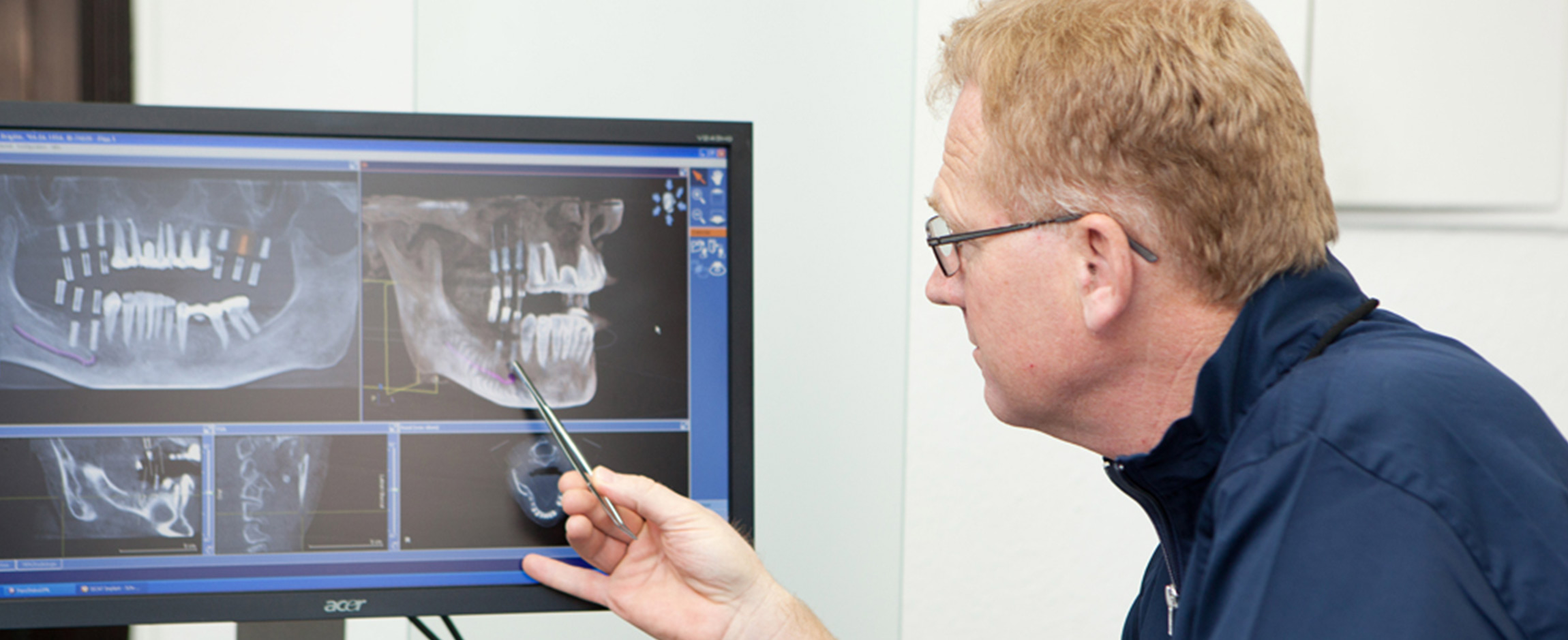 Mit dem computerunterstützten Einbringen der Zahnimplantate kann die Implantation schonend, sicher und präzise durchgeführt werden. Voraussetzung für diese Technik ist die Durchführung einer digitalen Volumentomographie.